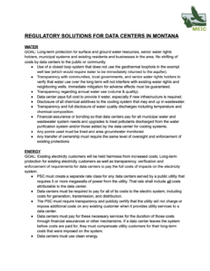 Montana currently does not have any state regulations limiting energy or water use of data centers. A study resolution on data centers (HJ 46: Sponsor Rep. Millet, R-Marion) did not pass out of committee during the 2025 Montana Legislative Session. However, HB 424 (Rep. Katie Zolnikov, R-Billings) did pass and extended the low property tax rate that data centers enjoy (0.9%) to new generating facilities connected to a data center.