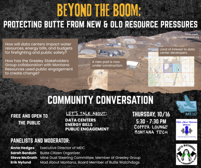 Join this panel discussion on October 16, which will explore changing state and federal energy policy and NorthWestern Energy proposals that could raise electricity bills. The panelists will also dive deeper into data center development in Montana, especially in Butte, and how public engagement can protect Butte.