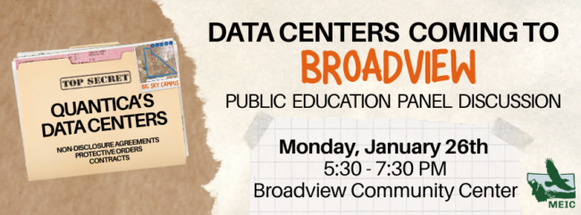 Join MEIC and partners for an educational panel discussion in Broadview to dig into what this data center could mean for local residents, what we know about the project so far, what we still need to find out, and how we can push for community-first decisions instead of corporate driven development.