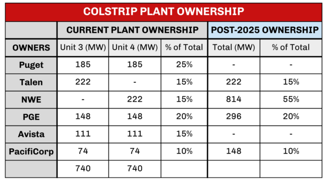 Washington-based utilities, Avista Corp and Puget Sound Energy, are original owners of the Colstrip plant, but both are exiting the plant because it is expensive and counter to the state’s energy goals. Both have cut deals to give their shares of the plant to NorthWestern starting on January 1, 2026. NorthWestern volunteered to take Avista’s share of the plant in Jan. 2023.